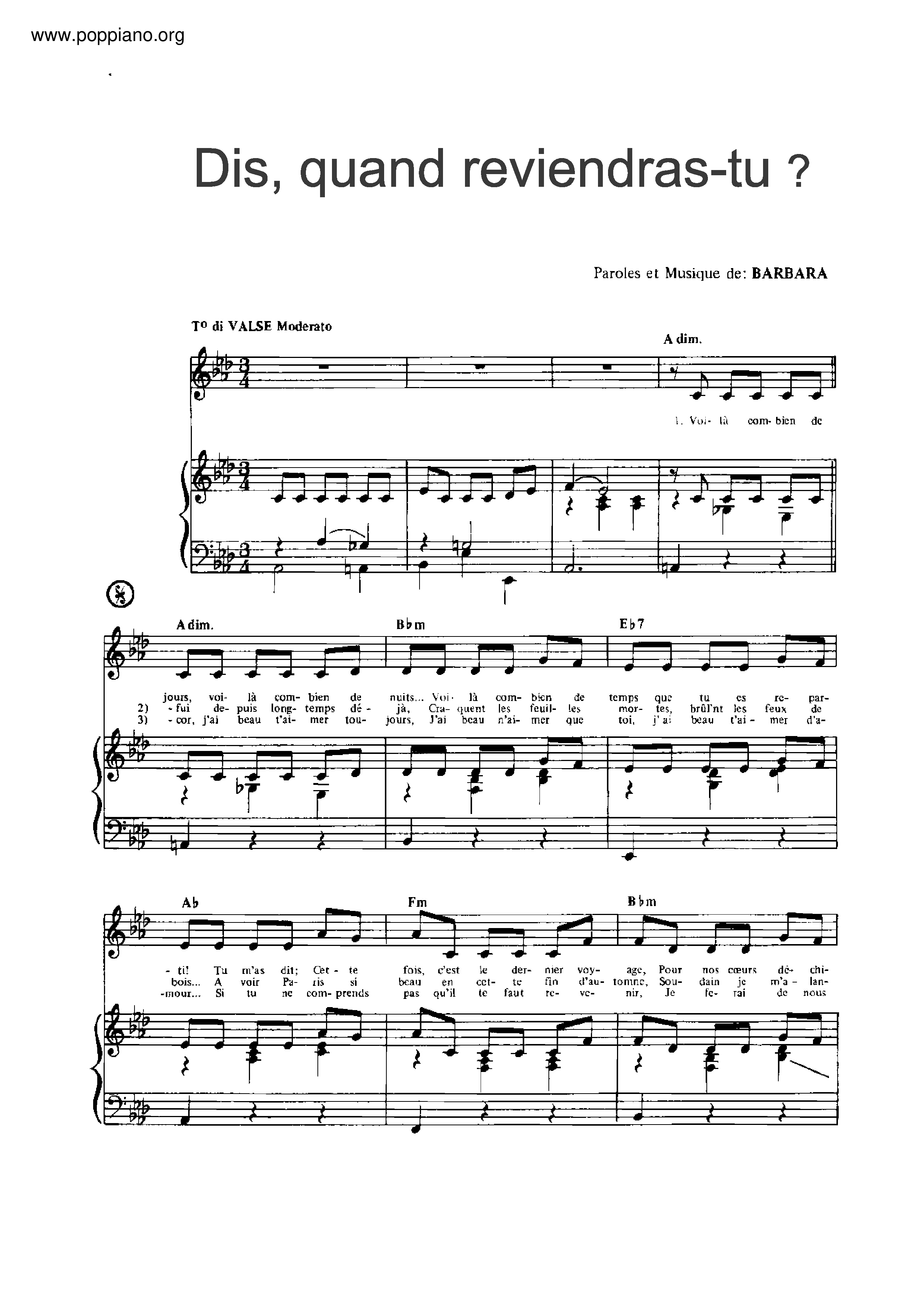 Share, download and print free sheet music of Dis Quand Reviendras-Tu Barbara for piano, guitar, flute and more with the world's largest community of sheet music creators, composers, performers, music teachers, students, beginners, artists and other musicians with over 1,000,000 sheet digital music to play, practice, learn and enjoy.