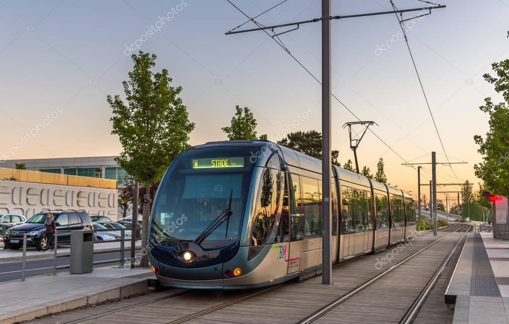 Tranvía Alstom Citadis 302 en la estación Palais des Congres en Burdeos, Francia. Sistema de