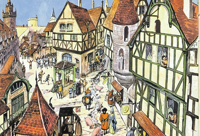 Images de ville médiévale. Derrière leurs remparts, les villes sont pleines de vie au Moyen Âge ! Marchés, boutiques, foires animent les rues et les places, tandis qu'au cœur de la cité s'agitent les constructeurs des cathédrales. Dans leurs déambulations, bourgeois, clercs et artisans côtoient les exclus, mendiants ou prostituées.
