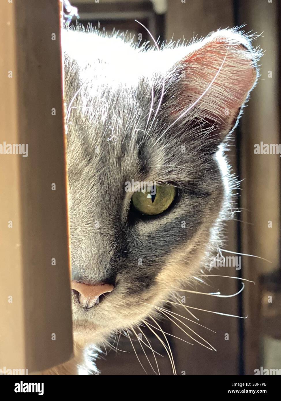 Le visage d’un chat qui se cache derrière une porte avec la lumière du soleil derrière elle