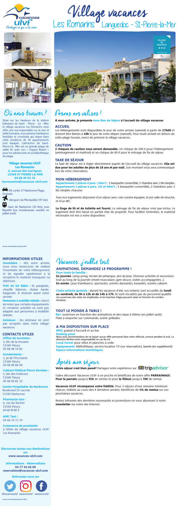 VACANCES ULVF LES ROMARINS. SAINT-PIERRE LA MER. Réserver. Page mise à jour le 31/01/2024. 4 avenue des garrigues11560 FLEURY. +33 4 68 49 83 76. reservation@vacances-ulvf.com. Site web. Réserver.