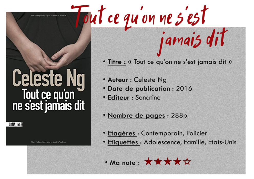 Avec « Tout ce qu'on ne s'est jamais dit », Céleste NG nous offre une immersion complète au cœur de la famille Lee, une famille mixte americano-chinoise victime de racisme et de désillusions. Une famille des années 70 pour qui la disparition de leur fille cadette va faire remonter une grand nombre de questionnements et de blessures.