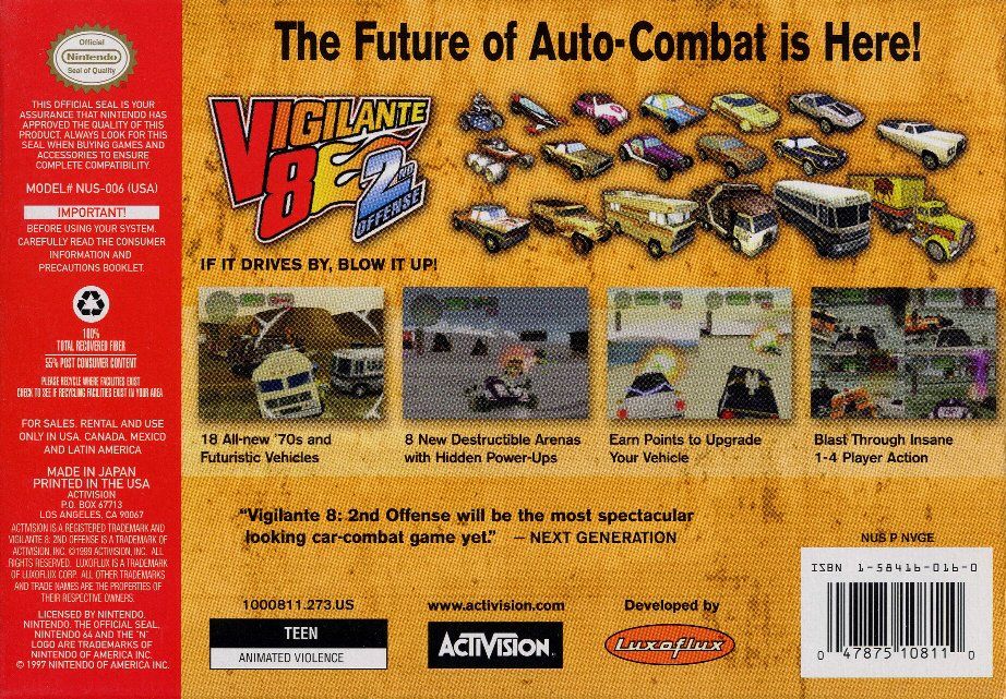 Part Number: N64_VIGILANTE_8_SECOND_OFFENSE. UPC: 047875108110. Condition: Used. Genre: Action & Adventure. Rating: 2350. Platform: Nintendo 64. Region: NTSC (N. America) Shipping: NoSpecials. ESRB: Teen. Feature 12 Game.. Vigilante 8 second offense. Awesome game. used to play it when I was a kid non stop. Get weapons blow up cars what more.